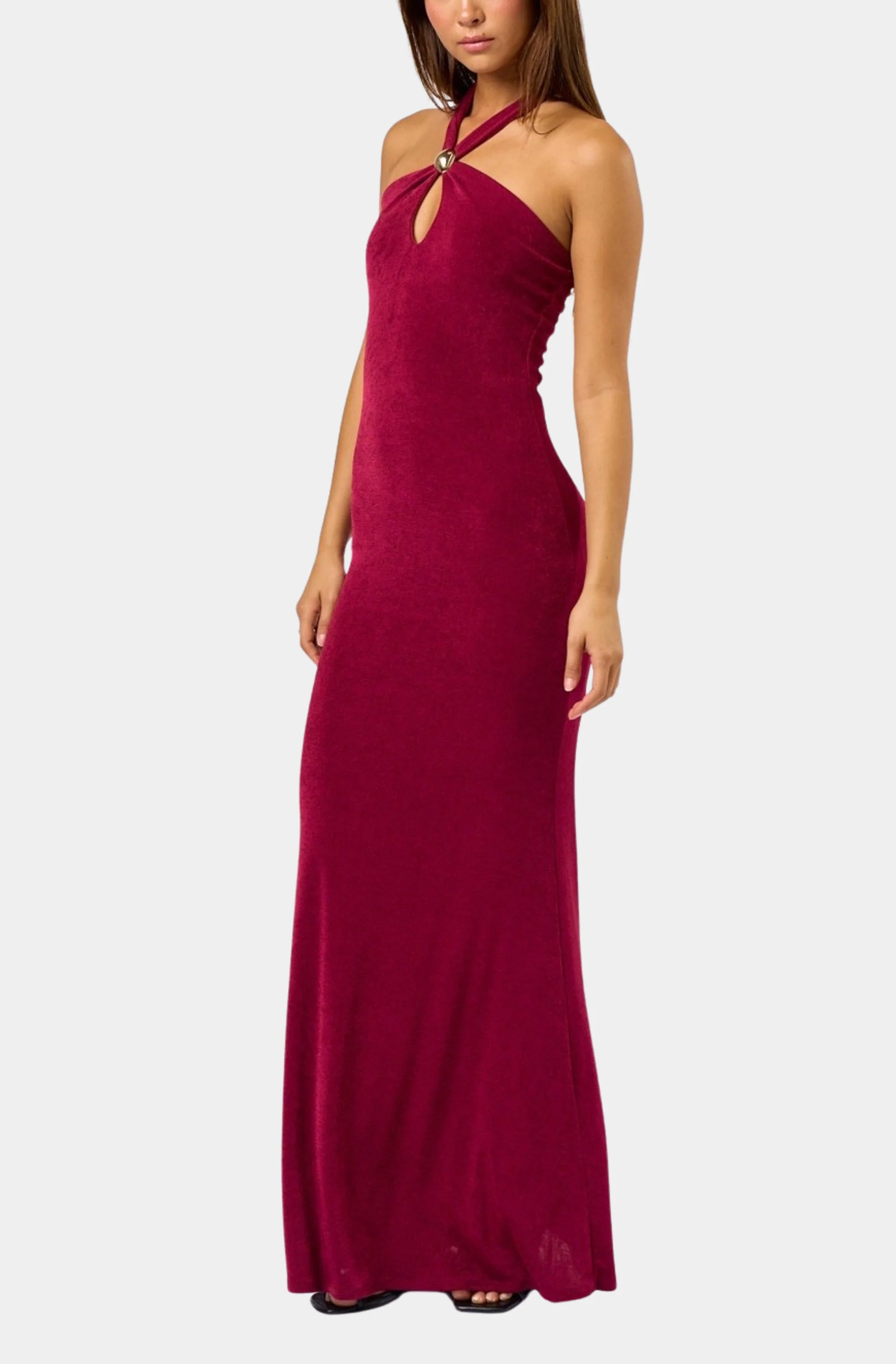 The Gabrielle Dress in burgundy is designed with a shimmer knit fabric and a halter neckline accented by gold hardware. A keyhole cutout and body-hugging fit give it a modern look, while the maxi length makes it ideal for special events or homecoming.