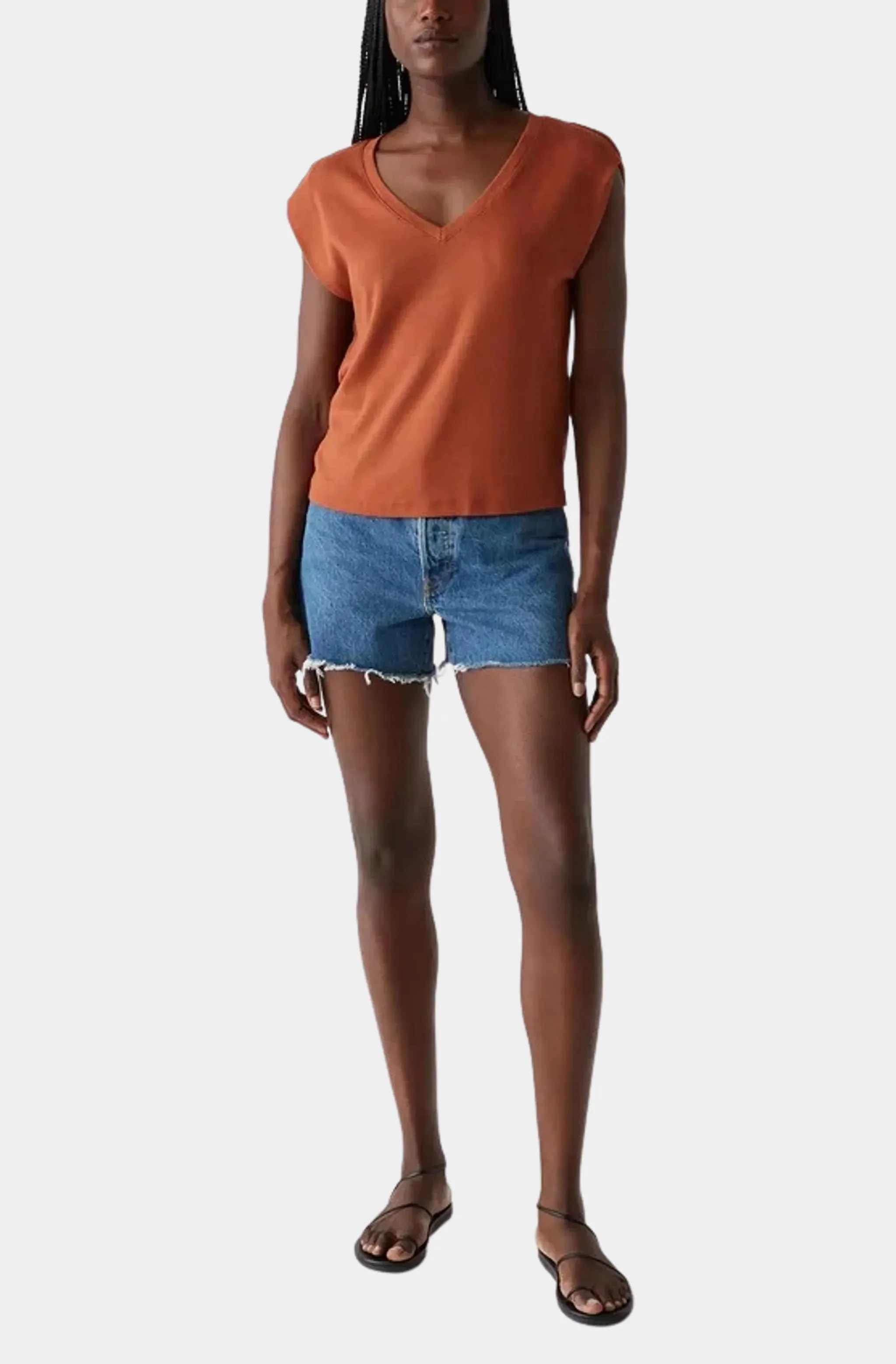 Elevate your style with the V-neck power shoulder top. This trendy piece features a bold v-neckline and dramatic power shoulders, making it a standout addition to any wardrobe. The slightly cropped, semi-fitted design pairs perfectly with high-waisted pants or skirts, creating a chic and modern silhouette.